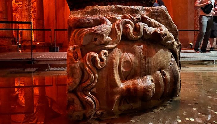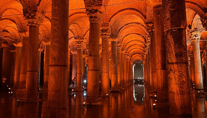Budowa Cysterny Bazyliki została zlecona przez bizantyjskiego cesarza Justyniana I w VI wieku naszej ery. Został zbudowany, aby dostarczać wodę do Wielkiego Pałacu i innych budynków w mieście. Posiada rozległą sieć sklepionych sufitów wspartych na 336 marmurowych kolumnach. Wiele kolumn zostało przeniesionych z wcześniejszych struktur, a niektóre z nich noszą ryciny i rzeźby z wcześniejszych cywilizacji, w tym z epoki rzymskiej i greckiej.